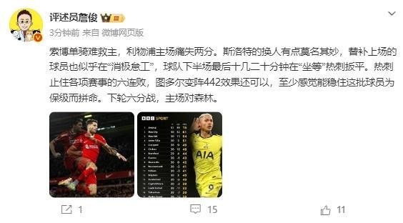 赛后,名嘴詹俊就公开质疑斯洛特的换人:有点莫名其妙,替补上场的球员也似乎在“消极怠工”,球队下半场最后十几二十分钟在“坐等”热刺扳平。