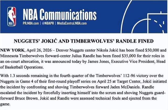 北京时间4月27日,NBA官方公布季后赛首轮G4掘金对阵森林狼赛后冲突的处罚结果:尼古拉·约基奇因主动挑起冲突被罚款3.5万美元,杰伦·兰德尔因参与激化矛盾被处以同等金额罚款,而森林狼球员麦克丹尼尔斯未遭任何处罚,双方无一人被禁赛。